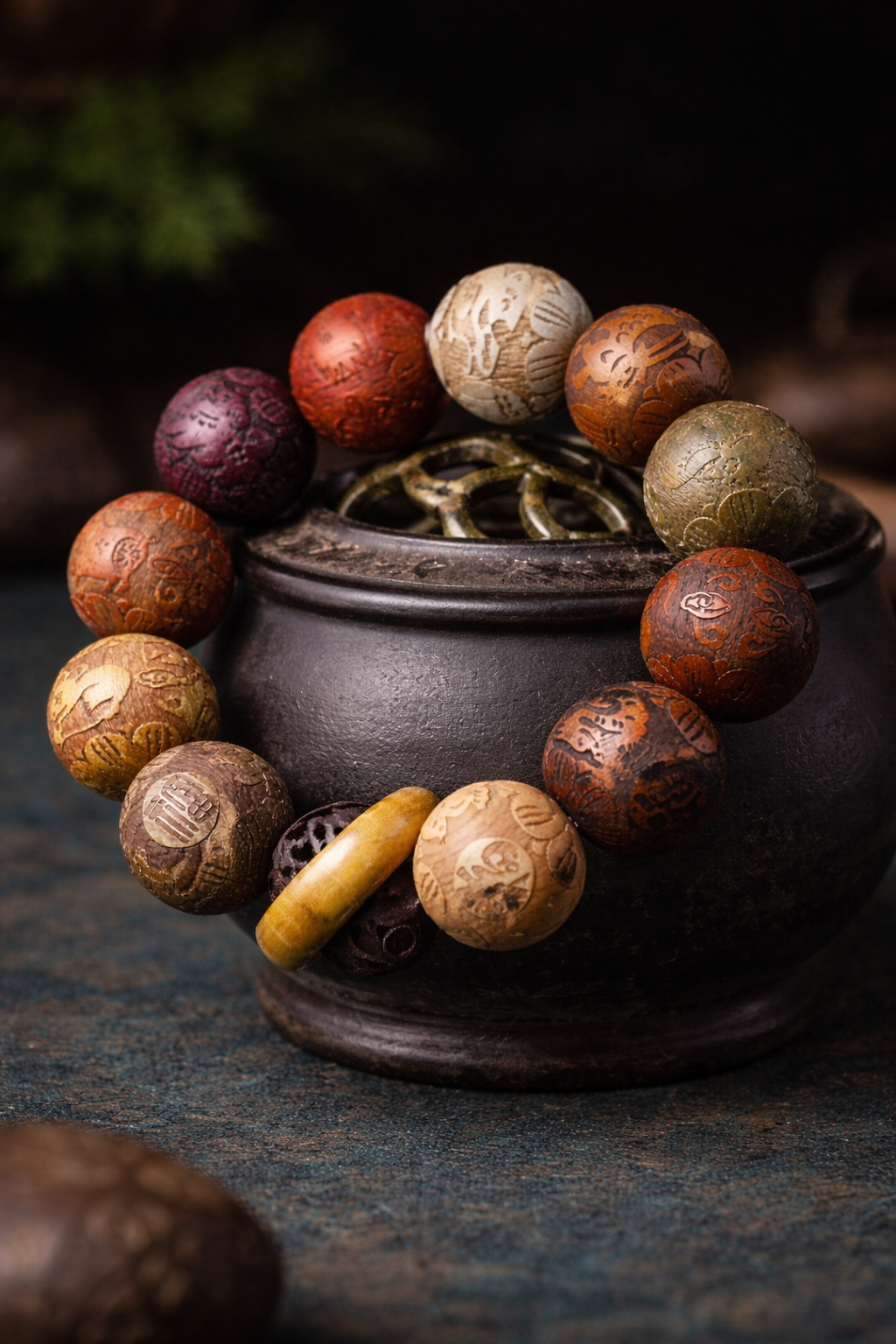 Chinese Zodiac Rosewood Green Sandalwood Ebony Wood Copper Coin Carved Calm Bracelet