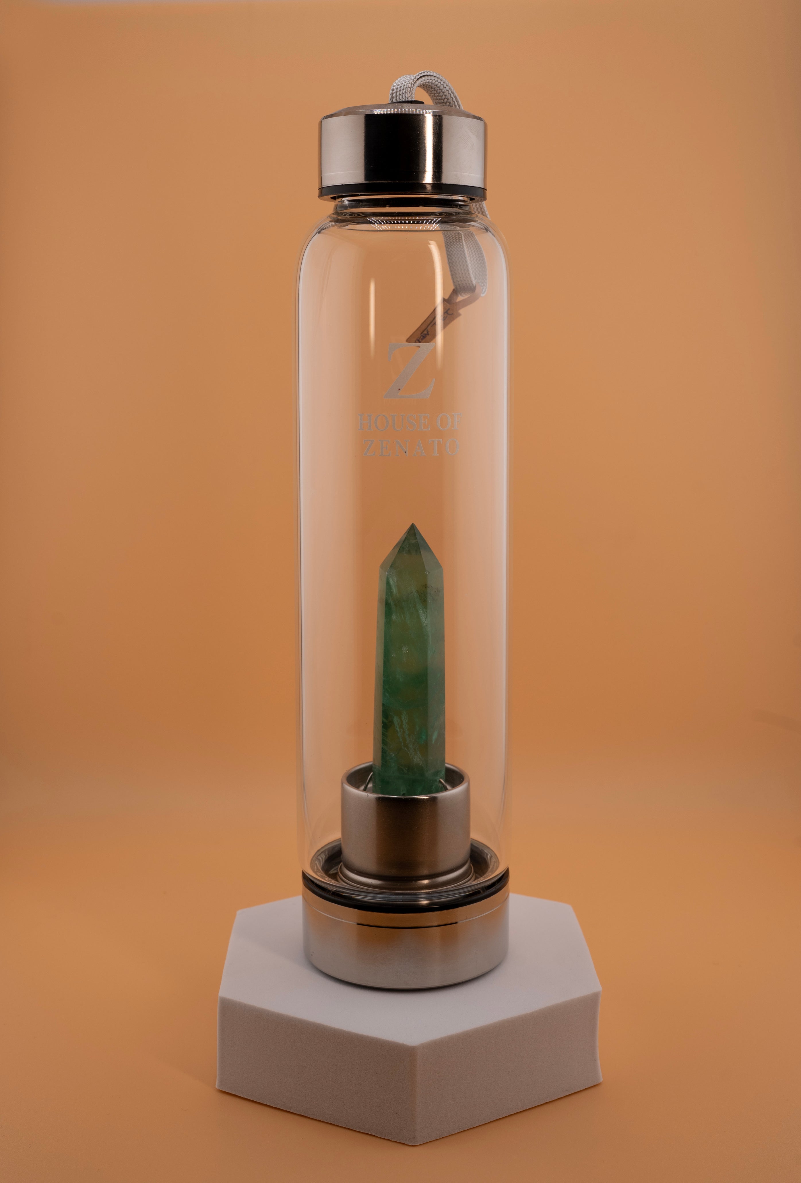 Green Fluorite Crystal Water Bottle – 18oz Borosilicate Glass Gemstone Elixir Bottle with Stainless Steel Lid – Healing Infuser Water Bottle for Clarity & Energy