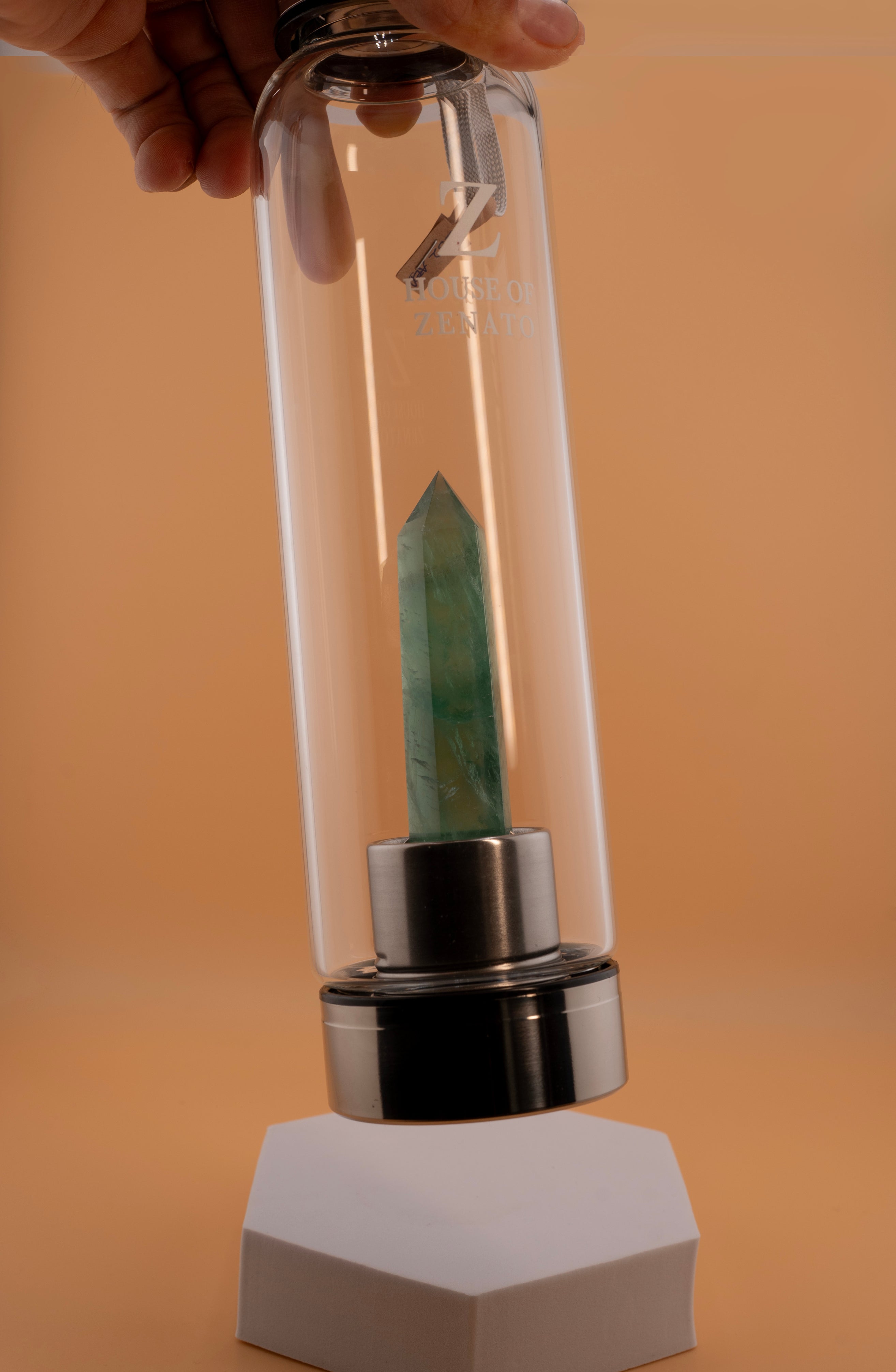 Elevate your hydration routine with the energy and clarity of Green Fluorite in this beautifully crafted Crystal Infuser Water Bottle. Designed to harmonize both body and mind, this 18oz glass elixir bottle features a genuine Green Fluorite point, suspended within a sleek borosilicate glass chamber, sealed by durable stainless steel caps.