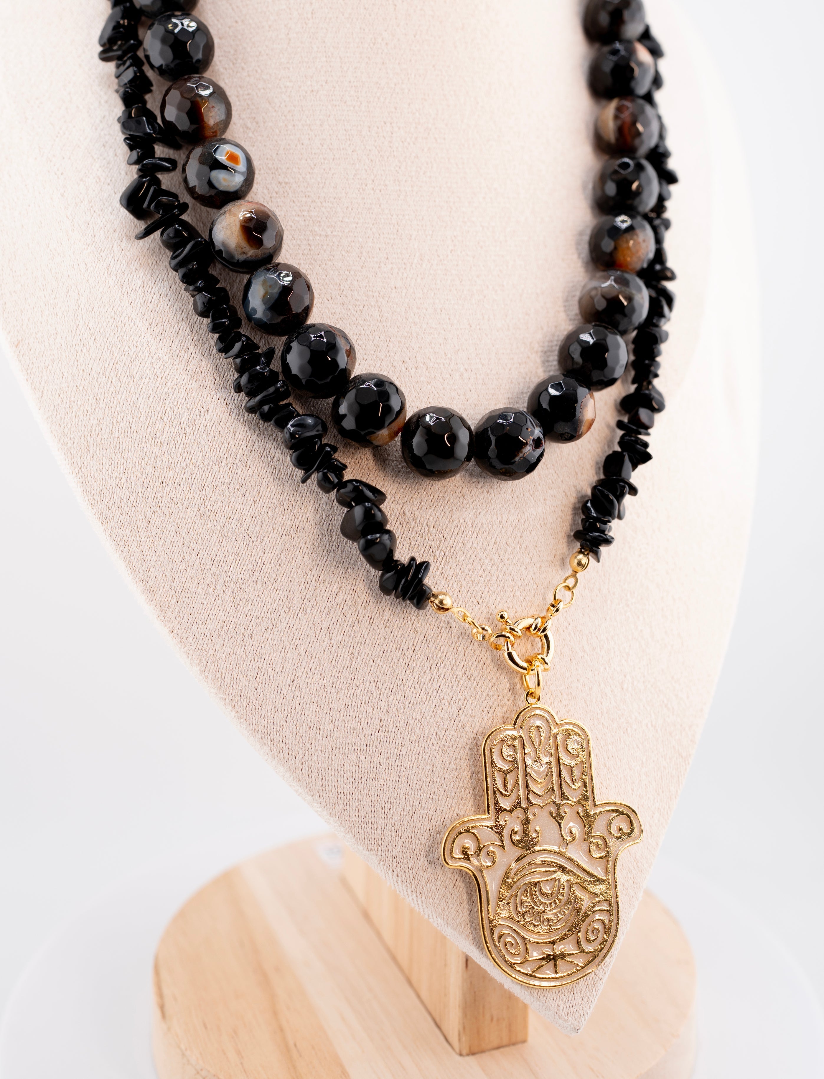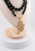 Elevate your energy and style with this handcrafted Black Onyx & Tiger Eye gemstone necklace, featuring a bold gold-tone Hamsa Hand pendant. This double-layer necklace is made from natural, polished stones that not only enhance your look but also provide powerful metaphysical benefits. Black Onyx is known for protection, grounding, and emotional strength, while Tiger Eye promotes confidence, clarity, and balance.