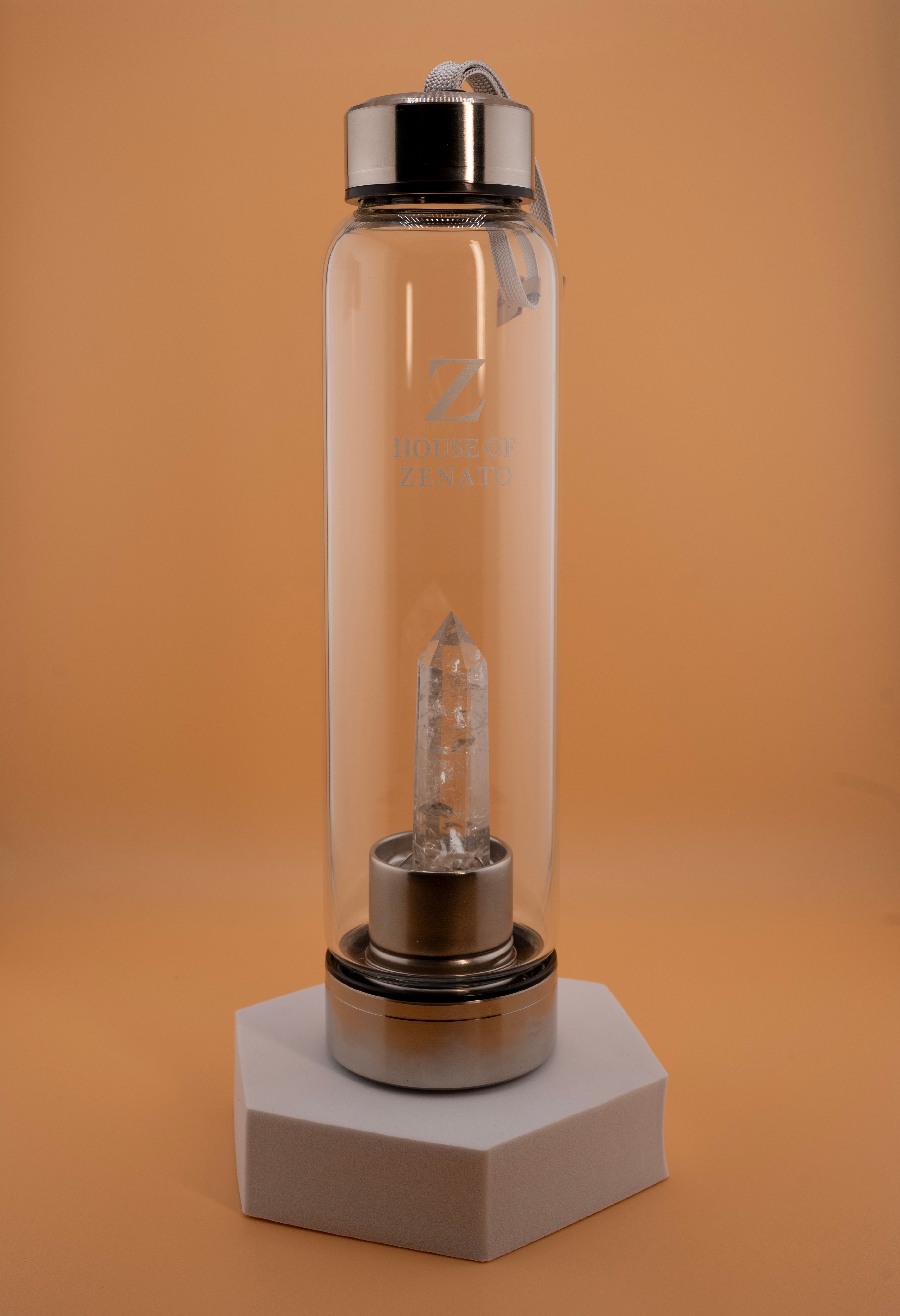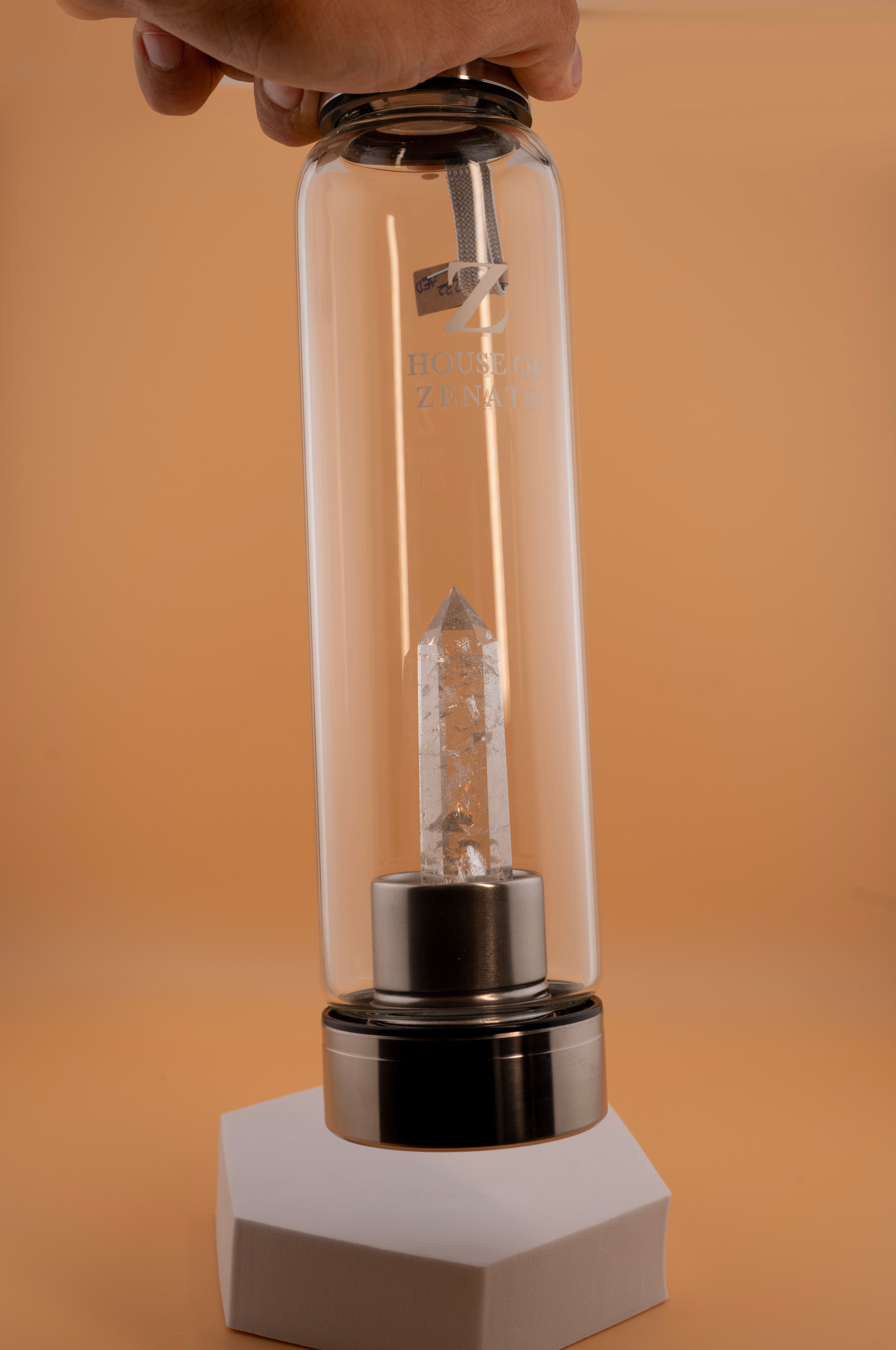 White crystals like Clear Quartz are revered for their powerful metaphysical properties and are widely regarded as “master healing stones.” When immersed in the water chamber, the crystal’s vibrational energy is believed to harmonize the water’s molecular structure, helping to infuse your beverage with revitalizing energy and heightened clarity.